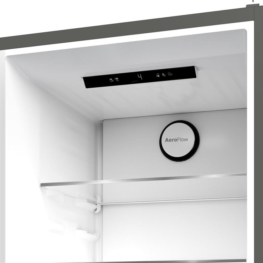 Kombinovaná chladnička, výška 203,5 cm, objem chladničky 249 l / mrazničky 106 l, energetická třída C, 10 let záruka na motor, systém Aeroflow – zajistí rovnoměrné chlazení a udržení čerstvosti potravin, přihrádka Harvestfresh – simuluje střídáním 3 barev světla a tmy sluneční svit, dvojitý systém chlazení NeoFrost – zabrání námraze, vnitřní LED displej, možnost změny otevírání směru dveří, hlučnost 35 dB, V × Š × H: 203,5 × 59,5 × 66,5 cm.