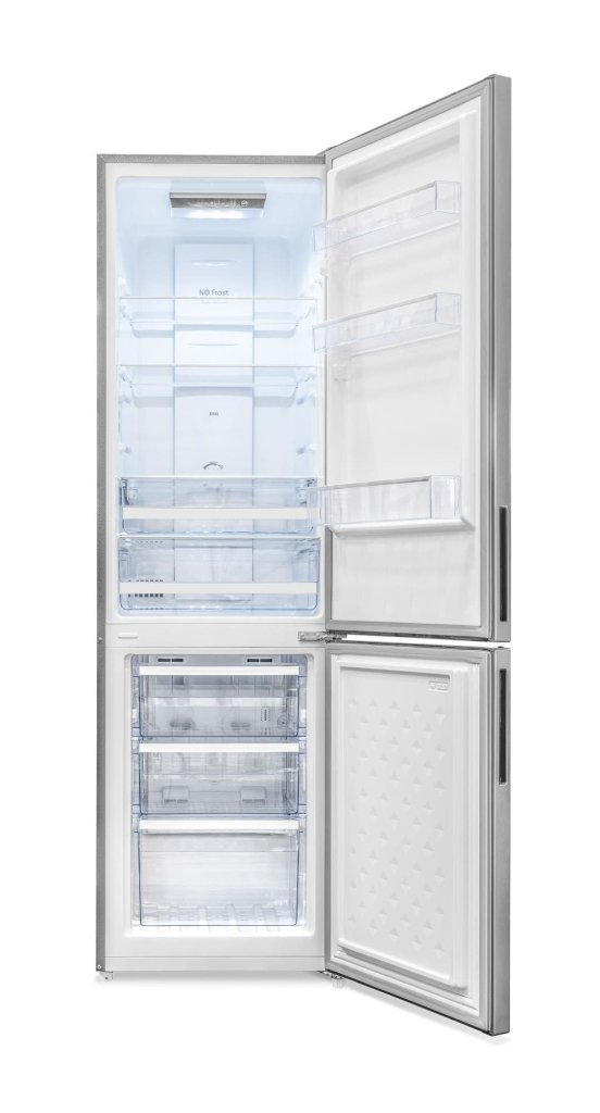 Kombinovaná chladnička, Spotřeba el. energie: 140 kWh/rok, objem celkem: 250 l, objem chladicí části: 180 l, objem mrazicí části: 70 l, hlučnost: 39 dB(A) re 1 pW, klimatická třída: SN-T (+10°C až +43°C), automatické odmrazování NoFrost, integrovaná madla, barva dveří: nerezový vzhled, barva boků: šedá, rozměry: 180 cm x 54,0 cm x 59,5 cm.