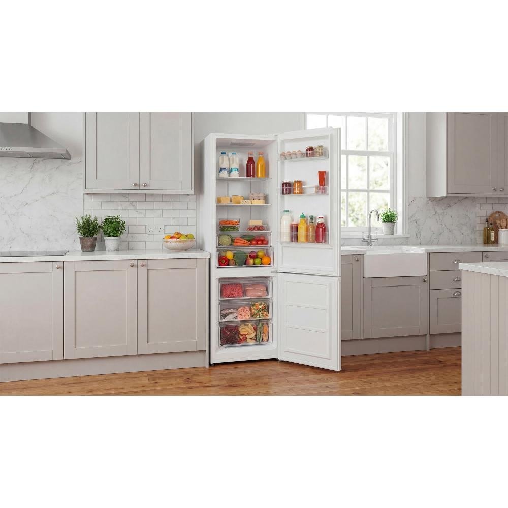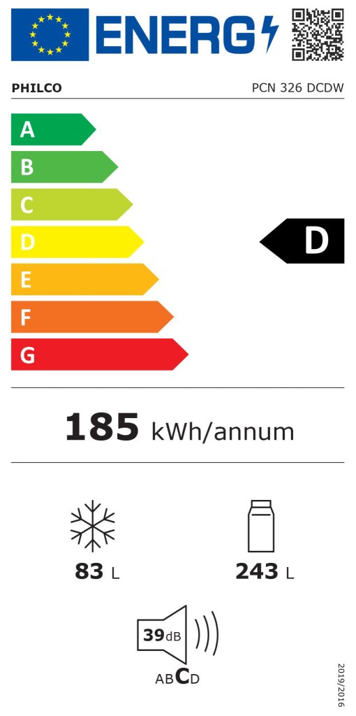 Kombinovaná chladnička, energetická třída D, celkový objem 326 l, roční spotřeba energie: 185 kWh, hlučnost: 39 dB, elektronické ovládání s vnitřním LED displejem, LED osvětlení, akumulační doba: 9,5 h, SuperFreeze – rychlé zmrazení, rozměry (V x Š x H): 201 x 60 x 60,5 cm.