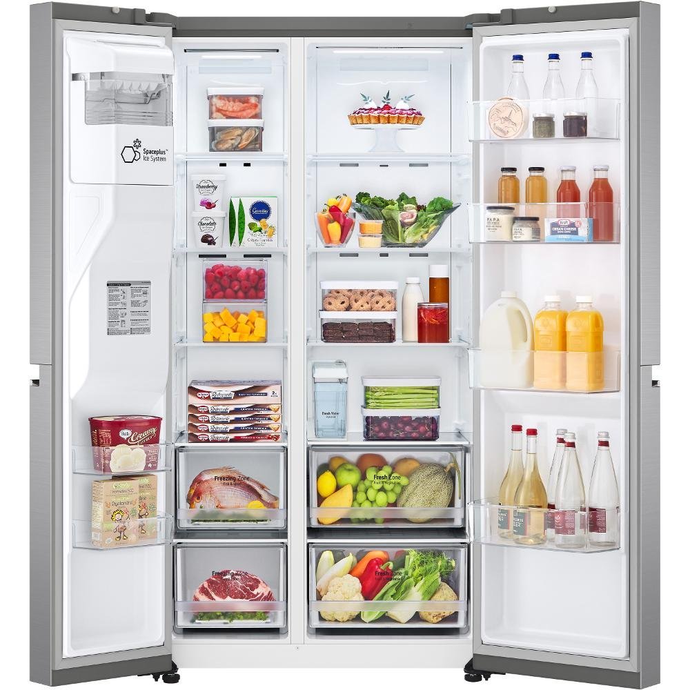 Americká chladnička, výška 179 cm, objem chladničky 416 l / mrazničky 219 l, energetická třída D, 10 let záruka na kompresor, technologie Door Cooling+™ – rychlejší obnova teploty, invertorový lineární kompresor LG, deodorizer – pohlcovač zápachu, svěží vzduch, nápojový automat a výrobník ledu, Wi-Fi, komunikace s mobilem, chytrá diagnostika, vnitřní LED displej, max. hlučnost 35 dB, V × Š × H: 179 × 91,3 × 73,5 cm.