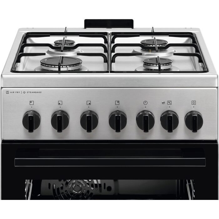 Kombinovaný sporák, energetická třída A, objem 57 l, horkovzdušná trouba s kruhovým topným tělesem, bezpečnostní/drátěné závěsy, funkce SteamBake – upečete dokonalé pečivo, muffiny a koláče, pojistka plynových hořáků, elektrické zapalování integrované v knoflíku, funkce AirFry pro přípravu hranolek a zeleniny s minimem tuku, mechanické – knoflíkové ovládání, gril/infragril, časovač/minutka, připojení 220–240 V, příslušenství: 1× plech na pečení koláčů, 1× plech na zachytávání mastnoty, 1× otočný rošt, 1× AirFry mřížka, rozměry (V x Š x H): 85,5 x 50 x 60 cm.