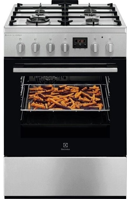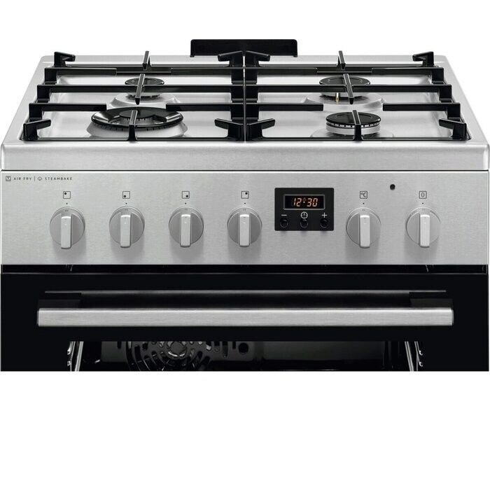 Kombinovaný sporák, energetická třída A, objem 57 l, horkovzdušná trouba s kruhovým topným tělesem, teleskopický výsuv, katalytické čištění, displej, funkce SteamBake – upečete dokonalé pečivo, muffiny a koláče, pojistka plynových hořáků, elektrické zapalování integrované v knoflíku, funkce AirFry pro přípravu hranolek a zeleniny s minimem tuku, mechanické – knoflíkové ovládání, gril/infragril, časovač/minutka, připojení 220–240 V, příslušenství: 1× plech na pečení koláčů, 1× plech na zachytávání mastnoty, 1× otočný rošt, 1× AirFry mřížka, rozměry (V x Š x H): 85,7 x 60 x 60 cm.