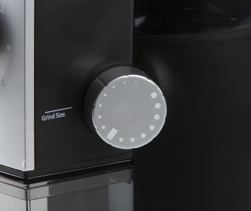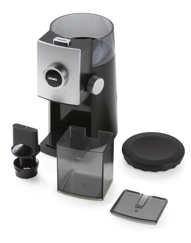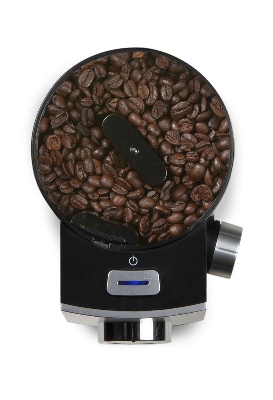 Elektrický mlýnek na kávu s mlecími kameny z vysokopevnostní oceli s plynulým nastavením hrubosti mletí a množství porcí kávy. Velká násypka na 300 g zrnkové kávy.
