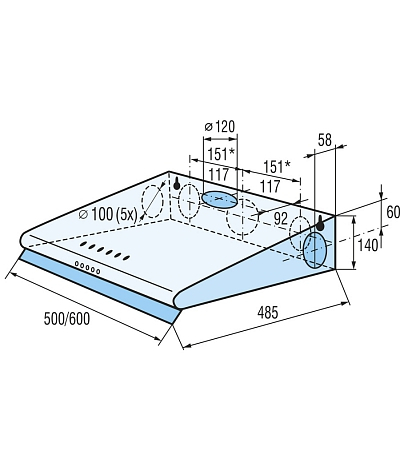 Energetická třída E 7 odtahů 3 rychlosti výkonu Tlačítkové ovládání Světelná signalizace provozu odsavače Přední skleněná náběhová lišta Odtah boční levý a pravý, zadní střední, zadní levý