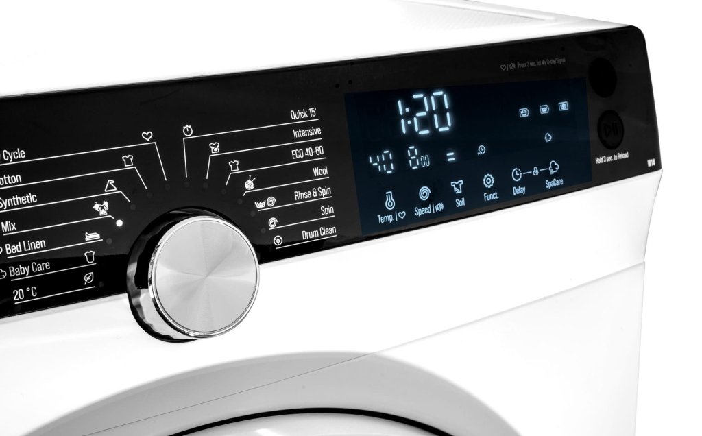Předem plněná pračka, Maximální náplň: 9 kg, Energetická třida A, Spotřeba vody: 50 l/cyklus, Spotřeba el. energie: 44 kWh/100 cyklů, Hlučnost při odstřeďování: 72 dB (A) re 1 pW, Maximální otáčky při odstředění: 1400/min, BLDC invertor motor, 14 programů, Dětská pojistka, Buben z nerezové oceli, 85,0 × 59,5 × 53,5 cm (60 cm včetně dvířek).