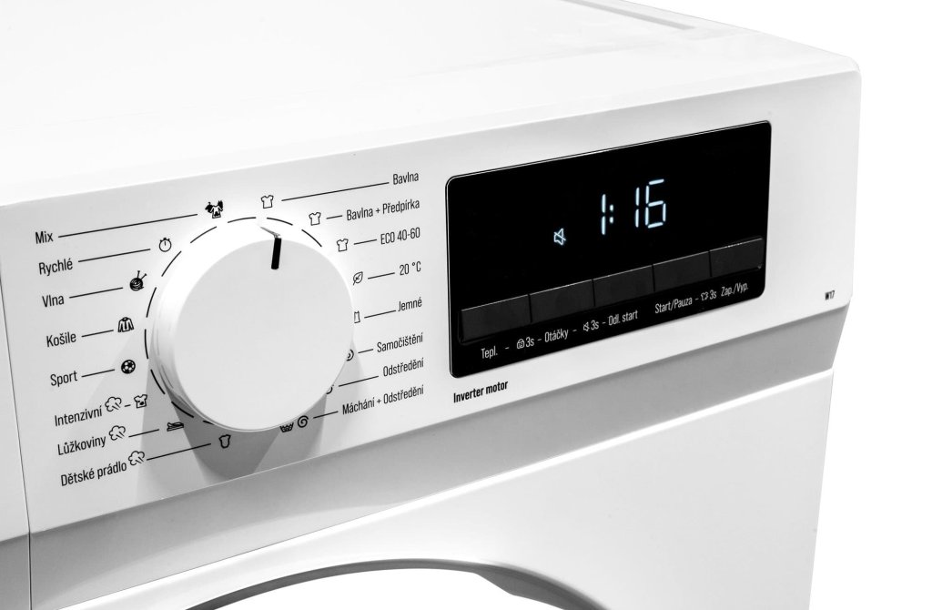 Předem plněná pračka, Maximální náplň: 7 kg, Spotřeba vody: 44 l/cyklus, Spotřeba el. energie: 40 kWh/100 cyklů, Třída energetické účinnosti: A -10%, Hlučnost při odstřeďování: 76 dB (A) re 1 pW, Maximální otáčky při odstředění: 1200/min, BLDC invertor motor, 16 pracích programů (3 parní), Dětská pojistka, Buben z nerezové oceli, 85 × 59,5 × 49,5 cm.