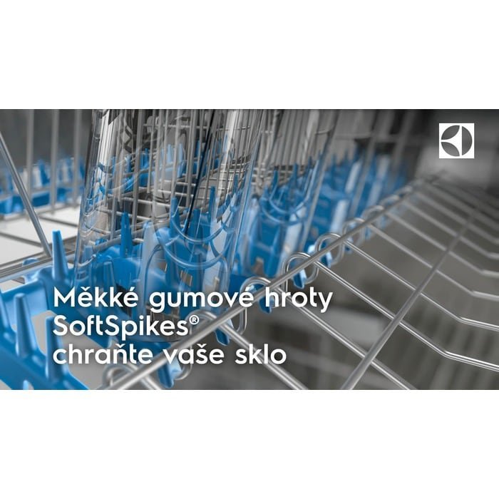 - Horní košík má 2 skládací držáky, 2 skládací drátěné držáky pro skleničky, 2 měkké špičky, 6 měkkých špiček pro vinné sklenky, skládací poličky na šálky, Plastové držadlo