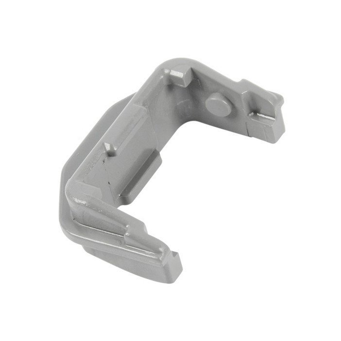 Tato tmavě šedá plastová zarážka slouží k tomu, aby horní koš myčky nádobí nevyjel z kolejniček.